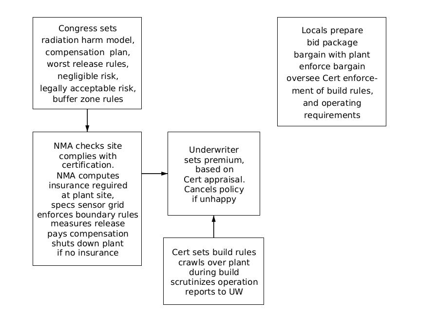 By far the most important is the insurance market. The NRA does not require Congress (nor a bureaucrat who get zero credit for a risk well taken) to evaluate how "safe" a design is. This difficult, specialized job is delegated to the people that do it best. They do it best because their livelihoods depend on evaluating risk. As long as there is competition in the insurance market, if they set the premium too high they will lose profitable business. If they set the premium too low, they will be wiped out. The NRA enlists this talent by requiring each plant to pay for any harm that it inflicts on the public, and making the insurance market responsible for making that payment.