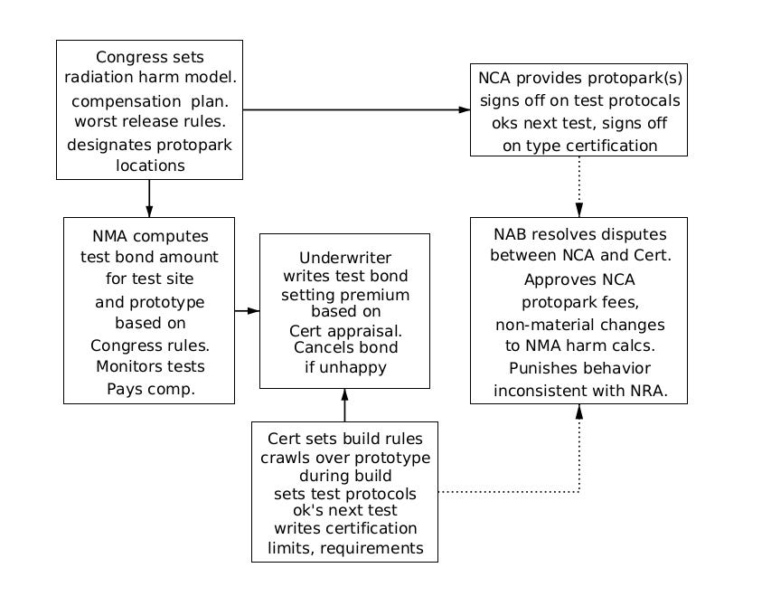 Figure 1 sketches the Certification stage. The Nuclear Certification Authority (NCA) provides testing facilities called protoparks on a user pays basis at the locations dictated by Congress. Any developer can apply to test his design. The Nuclear Monitoring Agency(NMA) computes the required testing bond using the technology agnostic process specified in the NRA. This is mechanical. If an Underwriter meeting the NRA's requirements is willing to write the bond amount, the developer can start testing. In setting the premium, the Underwriter not Congress evaluates the safety of the design.
