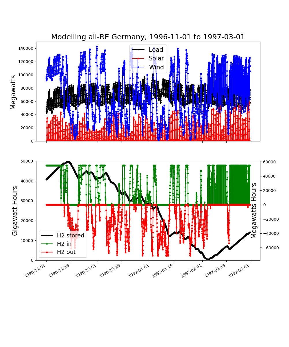Figure 2. Late 1996/early 1997 dunkelflauten. The reason why wind/solar appear to be capped at around 150 GW despite 450 GW nameplate is any power produced above current load plus H2 charge capacity has to be thrown away.