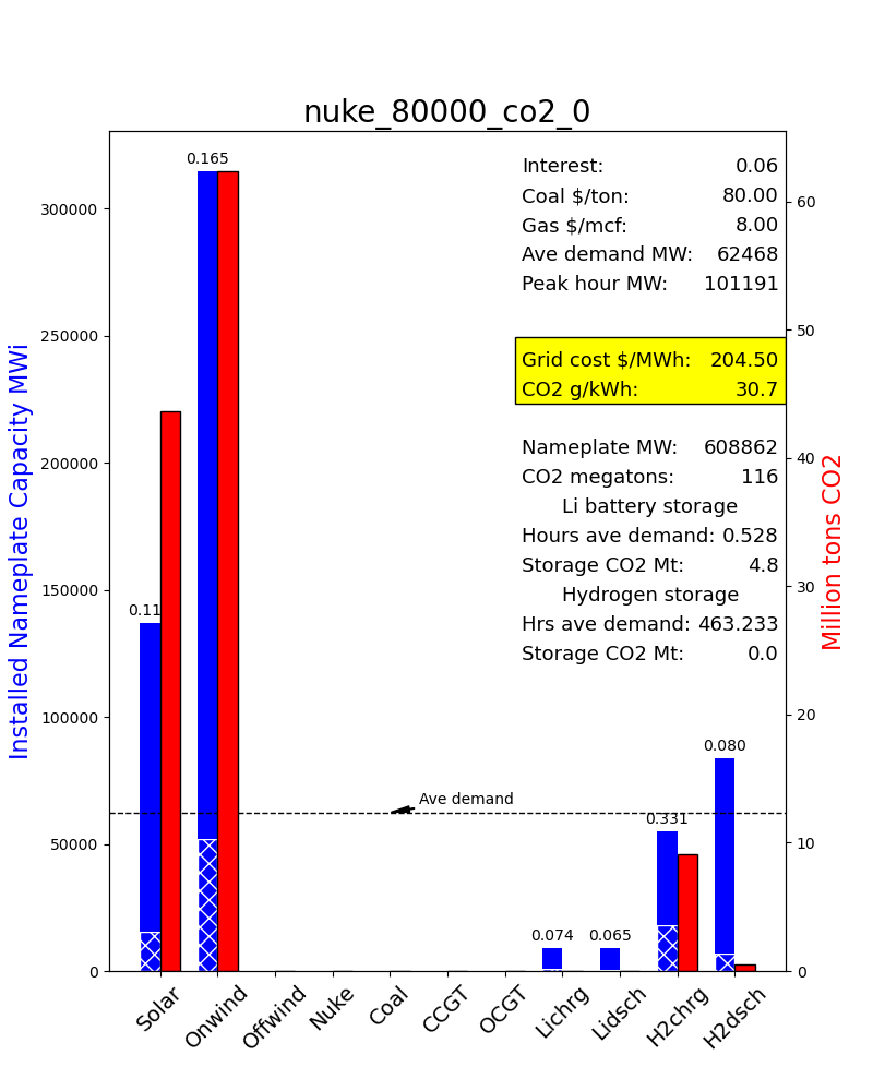 Figure 1 is a barchart of some of the most important numbers. Batteries are so expensive, the model makes almost no use of them. Instead it relies heavily on salt dome storage of hydrogen, installing just under 50,000 GWh worth of H2 storage. The H2 storage system cost is one-third of the total present valued cost of the gird. To charge this storage capacity in time to meet the demand, the program has to install an immense (probably infeasible) amount of wind and solar, 127 and 315 GW’s nameplate respectively. The total is 7 times the average load and 4.4 times the peak hourly load. This pushes the actual capacity factors down to 0.113 (solar) and 0.165 (wind). Over 2000 TWh’s of wind had to be curtailed. The result is extremely expensive electricity, 20.5 cents/kWh, with a fairly low CO2 intensity of 31 grams CO2 per kWh.