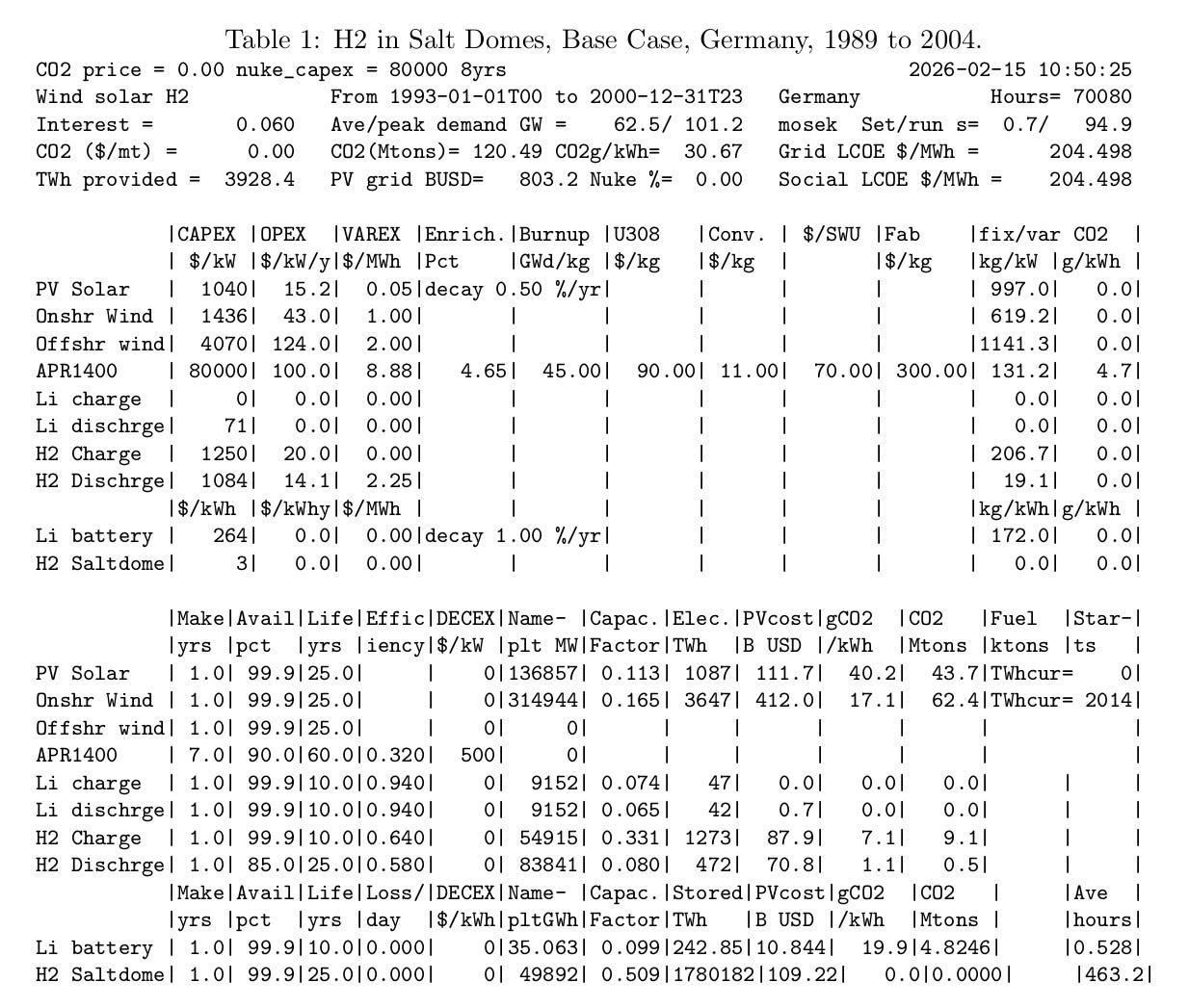 Table 1 shows the model’s results for a pure wind/solar/battery/hydrogen grid for Germany.