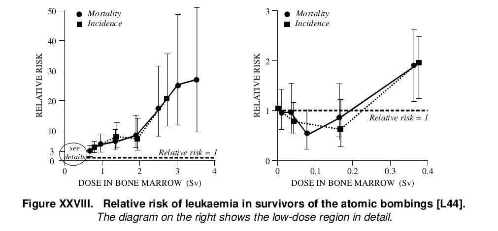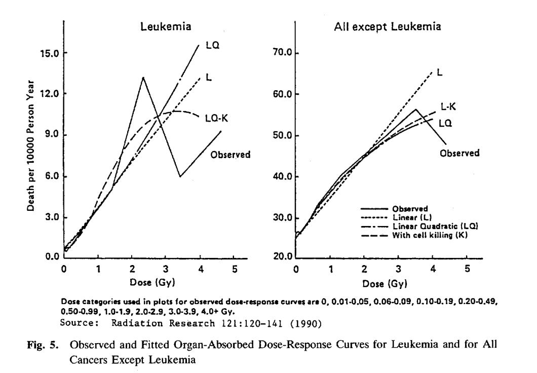 Emphasis mine. Apparently the difference between Figures 6 and 7 is that others accept that leukemia response is non-linear but solid cancer is not.