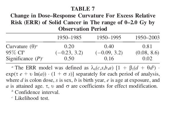 But what's interesting about Table 2 is the right side. You can't reject a linear term of zero in a linear-quadratic model for any of the shown dose ranges. The cryptic comment about "unstable" is not explained in the paper. 80% of the RERF data is below 0.1 Gy. How can a least-squares calc go "unstable"?
