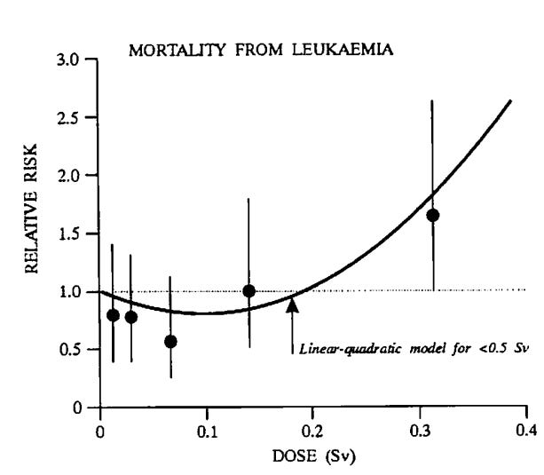 In a nuclear power plant release, the repair period dose range of interest is far below 2 Gy. It rarely more than 0.005 Gy in a day. Figure 3 is the linear-quadratic curve these authors fitted to their low end (less than 500 mGy) RERF leukemia data. This figure makes the point that the low end is clearly concave upward. However, the low end hook is relatively small and can easily get lost, if the dose range is large enough.