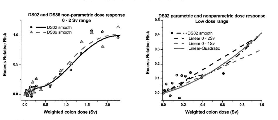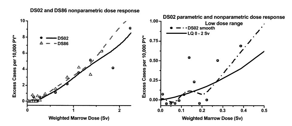 With either DS02 or DS86, when testing for nonlinearity using a linear-quadratic dose–response model, we find evidence of statistically significant upward curvature (P 5 0.01 for DS02 and P 5 0.03 for DS86) in the solid cancer dose response over the range 0–2 Sv.\cite{preston-2004}[p 384]