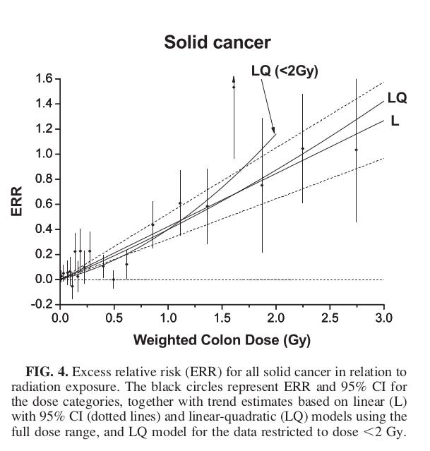 Preston et al find statistically significant curvature in both the leukemia and solid cancer ($P = 0.01$) mortality data.\cite{preston-2004} They accept that the leukemia response is non-linear, but toss their solid cancer results aside using an unusual argument.