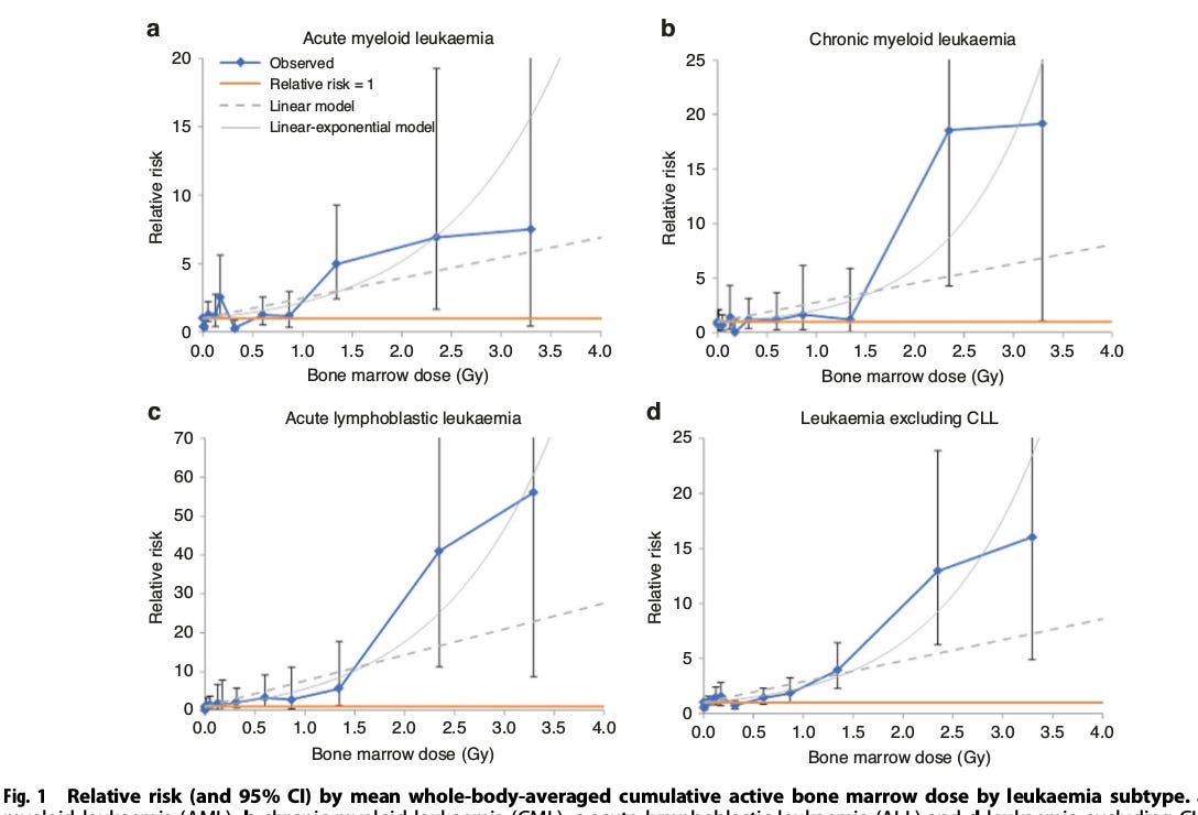 We observed significantly increasing risk with dose for AML, CML and ALL, with some indication of upward curvature in the dose response over the full dose range for all three endpoints,\cite{little-2023}[p 1157]