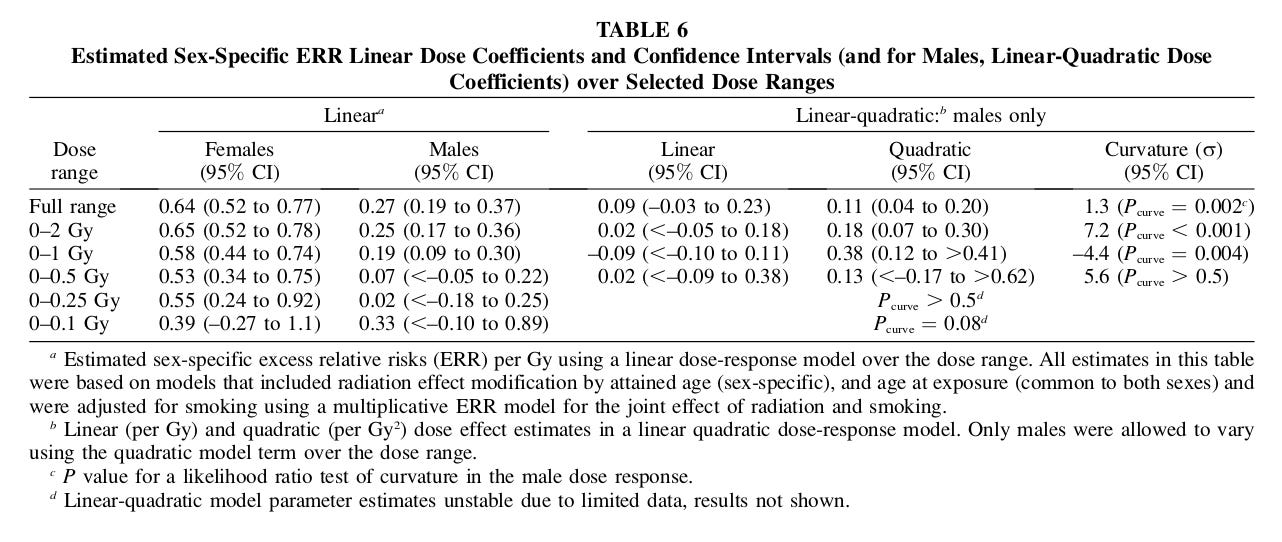 The dose response, however, exhibited statistically significant (P ¼ 0.03) upward curvature in a linear-quadratic dose-response model that assumed common curvature for males and females. The common curvature (r) was estimated to be 0.22 per Gy (95% CI: 0.01 to 0.60). The linear dose coefficients for males and females were 0.21 (95% CI: 0.12 to 0.31) and 0.49 (95% CI: 0.33 to 0.67), respectively (data not shown). Allowing the curvature to differ for males and females led to a further statistically significant improvement in fit (P ¼ 0.02 compared to the common curvature model and P ¼ 0.007 compared to the linear model). For males, the linear dose coefficient was 0.087 (95% CI: –0.03 to 0.23) with a quadratic estimate of 0.11 (95% CI: 0.04 to 0.20) resulting in a curvature estimate of 1.3 (Pcurve ¼ 0.002). For females, the linear estimate was 0.57 (95% CI: 0.40 to 0.77) with a quadratic estimate of 0.049 (95\% CI –0.06 to 0.16) and a curvature estimate of 0.084 (Pcurve ¼ 0.39). Thus, while the dose response for females was consistent with linearity, for males it exhibited significant upward curvature.\cite{grant-2017}[p 523]
