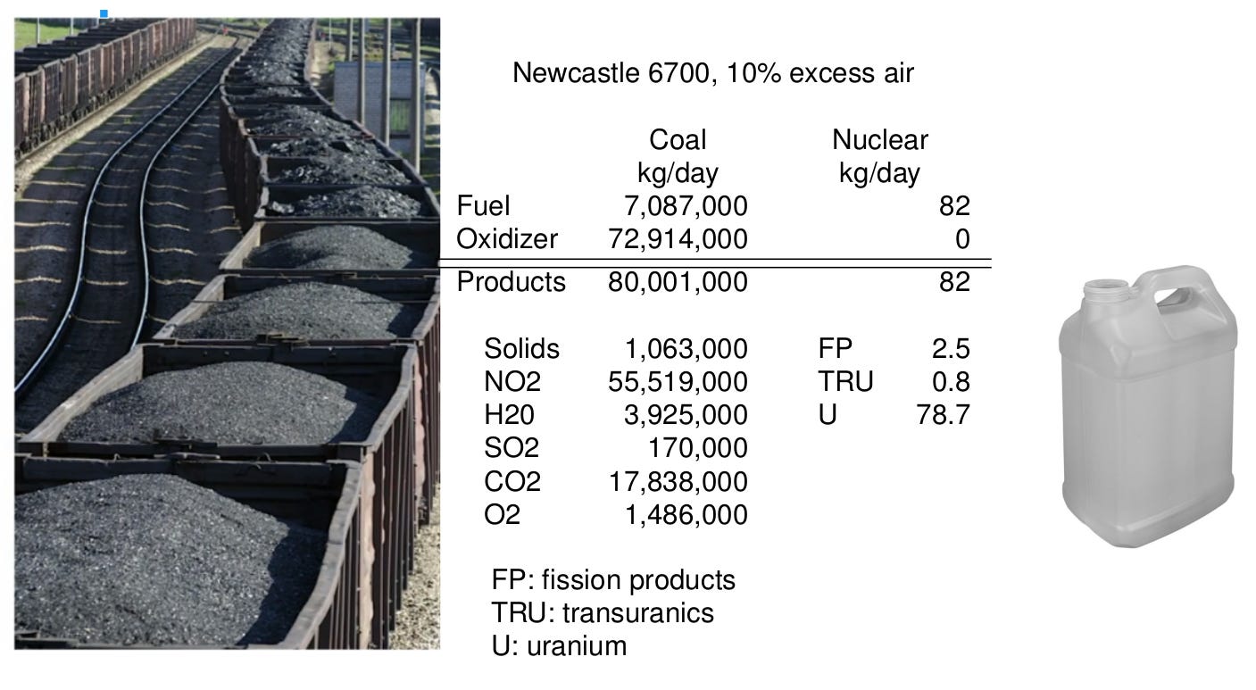 Figure 4. Fuel for 1 GW plant for one day. The coal plant’s fuel requires a 70 car train. The nuclear plant’s fuel fits in a two gallon jug. Newcastle 6700 is a good coal. Most coal’s are worse.