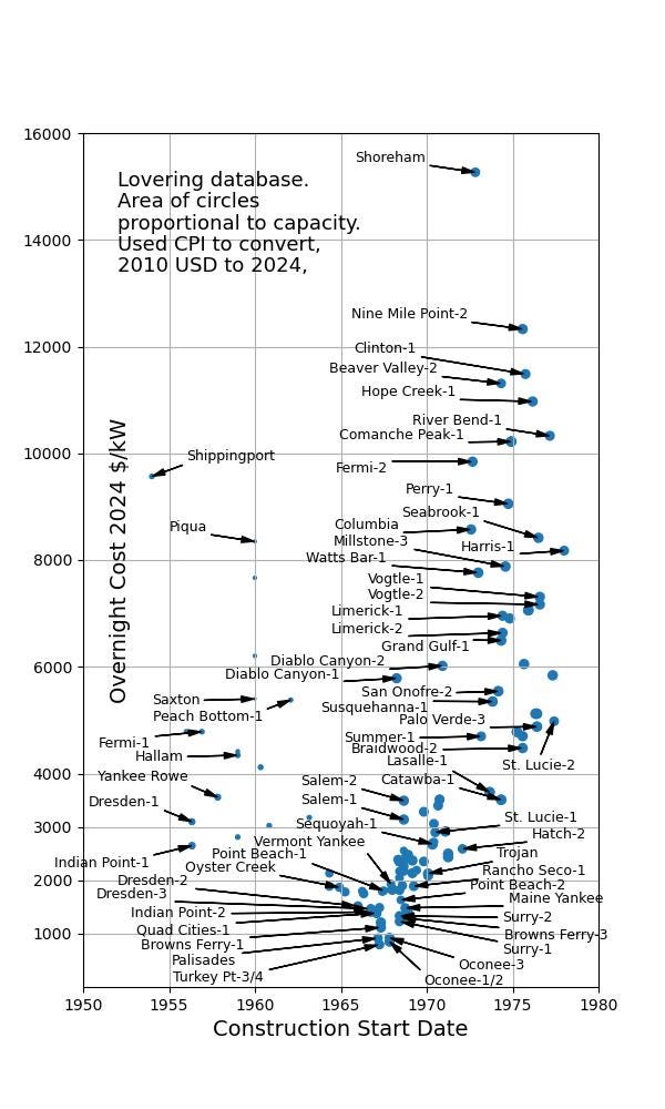 This did not last long. Figure 6 shows the Overnight Cost of USA nuke plants built between 1950 and 1980 in 2024 dollars. The date shown is the date that construction started. Almost all the plants started between 1964 and 1968 came in at under $2000/kW in 2024 dollars. Six of those plants came in at under $1000/kW in today’s money, Figure 1. Five of them are still operating. Palisades shut down in 2022, but may reopen. These early plants have been producing some of the cheapest electricity ever generated for more than 50 years; and no member of the public has been harmed.
