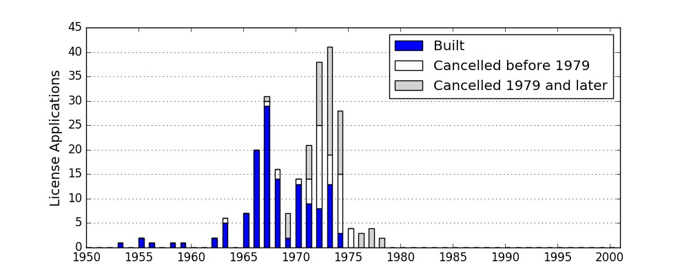 Figure 14. USA Nuclear Power Plant Orders, reference \cite{eia-1997}[Table C-1] Check out the ordering boom in 1966 and 1967. In those two years, 49 plants were ordered totaling 40 GW of power. This became known as the Bandwagon Market.