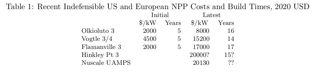 Nuclear power in the West is a disastrously expensive mess. Table 1 shows where we are. Current builds have capital costs that are more than ten times higher than Oconee and her sisters. Only the wealthiest nations can afford these kind of costs, and then only sporadically. The construction times are such that there is no way nuclear can put a dent in global warming, or anything else. And it keeps getting worse. If this is the way things must be, nuclear power is a dead end, and rightly so.