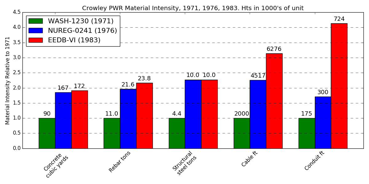 Figure 12.. Crowley’s material estimates, 1971 to 1983. In that period, conduit and cabling should have dropped drastically due to massive increases in bandwidth. But the NRC outlawed multiplexing.
