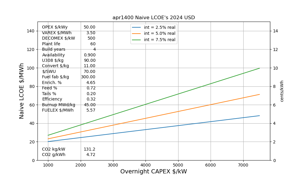 Figure 7 shows that if you combine these overnight CAPEX numbers with a four year build time and low risk, interest rates (which requires near zero regulatory risk), a nuclear plant can easily produce base load electricity at 3 cents/kWh in 2024 dollars.