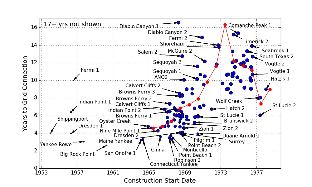Figure 8. USA Build Times. Red dots are average for that start year. Area of blue dots is proportional to plant capacity. 17 years and more not shown. Data from IAEA PRIS database.