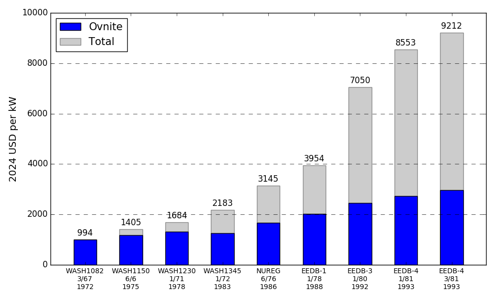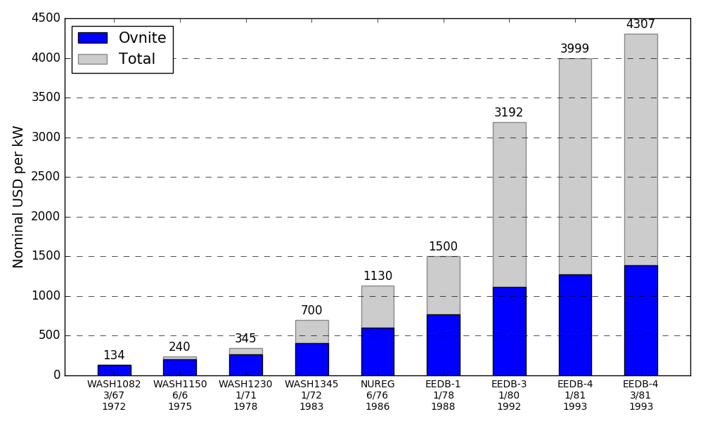 Starting in 1978, the DOE funded a detailed cost study called the Energy Economic Data Base (EEDB). John Crowley was the guy who headed the team that developed and maintained the EEDB. Figure 10 shows Crowley’s 1982 estimates of the total CAPEX for American nuclear plants, through the 1970’s. The right hand side of the figure are partially projections of what was happening in 1982. The figure is in nominal dollars based on the (projected) year of completion. The total CAPEX increase in dollars of the day is about a factor of 10.