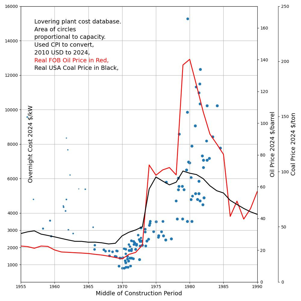 Figure 9. Fossil prices and USA nuclear overnight CAPEX. The oil price index is a little misleading. It’s an average of prices at the loading ports. The landed price jumped earlier due to the tanker market boom in 1967. You can see that in the US coal prices.