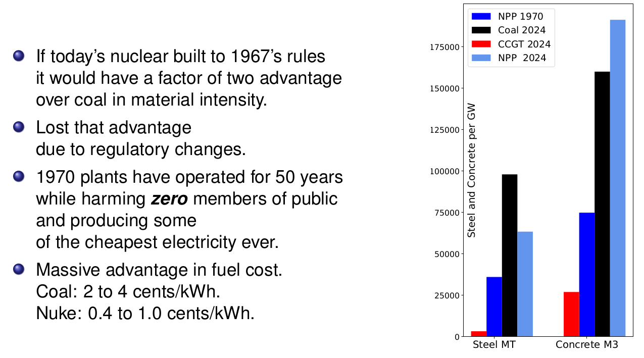 Indeed, in the 1960’s, nuclear’s 100,000 to 1 advantage in energy density allowed nascent nuclear power, which was just starting down a steep learning curve, to go head to head with coal. In 1965, GE was able to show TVA that it would produce electricity for less than 3.7 mills per kilowatt hour.\cite{bupp-1978}[page 90] That’s about 3.2 cents per kWh in 2024 dollars. Komanoff, no friend of nuclear power, estimated nuclear’s 1971 CAPEX at 366 1979 dollars per kW, and coal without scrubbers at $346/kW.\cite{komanoff-1981}[p 20] Nuclear’s fuel cost advantage tipped the cost of electricity in favor of nuclear. In 1970, Paul Ehrlich, a determined foe of nuclear on Malthusian grounds, complained ``Contrary to widely held belief, nuclear power is not now `dirt cheap’. ... At best, both [nuclear and coal] produce power for approximately 4-5 mills per kilowatt-hour.”\cite{ehrlich-1970}[p 57] In the late 1960’s nuclear power was as cheap as coal, when coal was as cheap as it ever was in real terms.