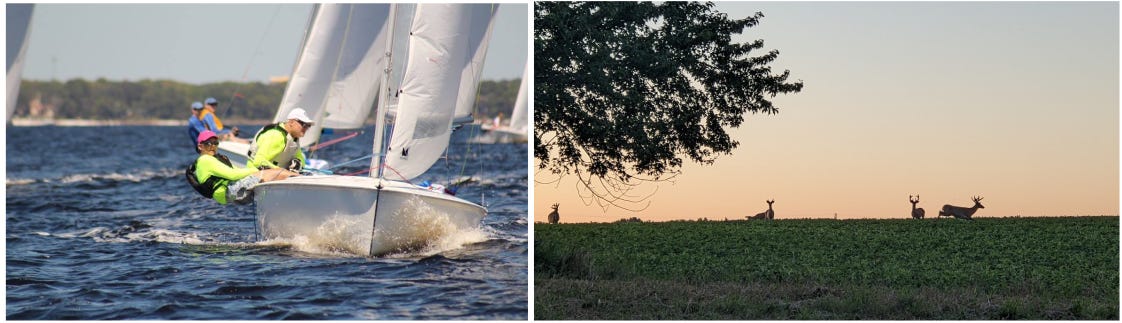 Figure 5. Clinton Power Plant, 1068 MWe, no coal yard, no boiler, no SCR, no baghouse, no big fans, no scrubber, no big stack. Clinton sits on a 5000 acre artificial lake, which serves as its cooling pond. The lake is surrounded by trails, beaches, and a wildlife preserve. It supports active rowing, fishing, and sailing communities. Every fall the lake hosts the Glow Regatta, which attracts sailors from all over the Midwest. Glow is short for Glow-in-the-dark, a cheeky thank you to the lake’s mother.