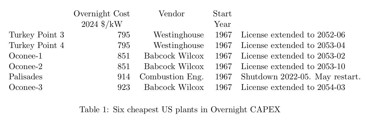 The US’s first full scale plants in the mid-late-1960’s were the cheapest nuclear plants ever built. Six of those plants came in at an overnight cost of less than $1000 per kW in today’s money, Table 1. At the time we had four major vendors (B&W, Combustion Engineering, GE, and Westinghouse) fighting for the market combined with a regulator that was still more promotional then preventional. Basically, the vendors self-regulated. As the vendors gained experience from building more and more plants in the early 1970’s, the costs skyrocketed.