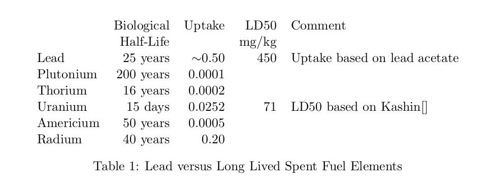 All heavy metals are poisons. The one we are most familiar with is lead, Figure 1. Table 1 compares the long lived, spent fuel elements with lead. I’ve also thrown in radium, even though it is not a spent fuel component.