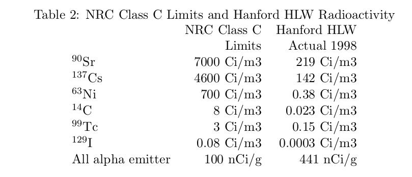 I have no idea how NRC came up with a 100 nCi/g, for something that must be swallowed to be a problem; but for the moment let’s accept that number. All that would be needed is 4.4 grams of glass and grout to gram of spent fuel. It’s true that the Hanford spent fuel is not a good proxy for commercial spent fuel, mainly because the fuel was extracted from the reactor after something like 60 days of operation, well before the long lived fission products, most importantly Cs-137, had a chance to build up. But that just means we will have to wait longer than 50 years.