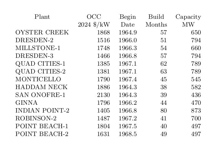 Table 1. Overnight Capital Cost (OCC) of USA Turnkey Plants.\cite{lovering-2016} Only one of these plants came in at over $2000/kW in today's money.